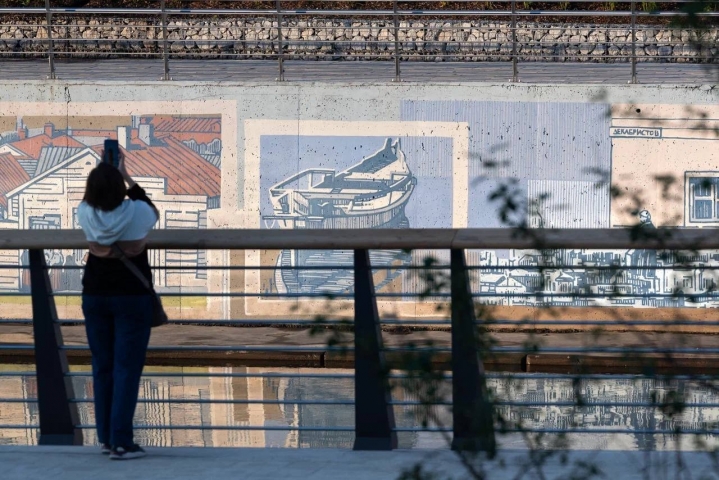Еще одно впечатляющее творение – мурал “На берегу этой тихой реки” от художника из Уфы Мансура Зияева. Эта гигантская панорамная роспись, занимающая более 600 квадратных метров, оживила набережную Исети. Зрители словно отправляются в визуальное путешествие из тихой сельской местности в шумный город. Художник искусно переплетает деревенскую идиллию с панорамой старого Свердловска, используя архивные фотографии Екатеринбурга: Царский мост, дом Ипатьева, Тарасовская набережная и даже венецианские лодки, напоминая, что Урал всегда был местом встречи разных культур и эпох.