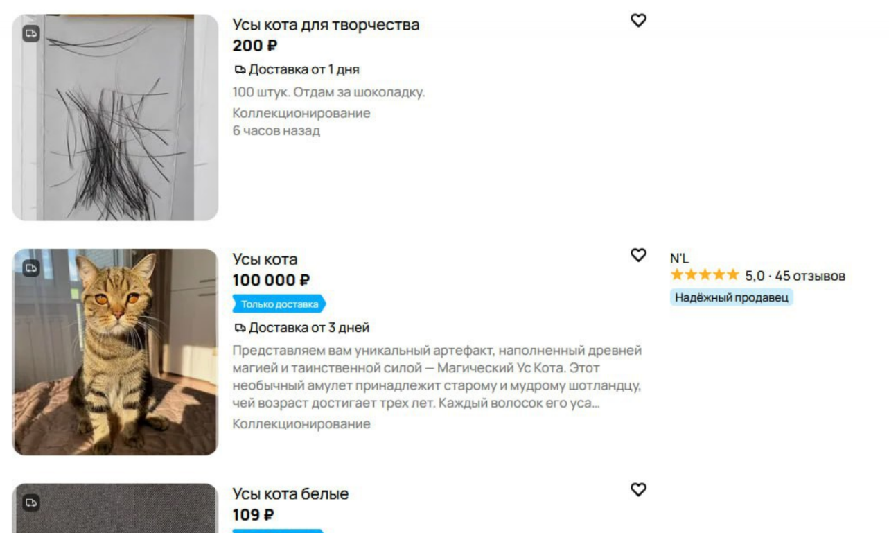 Предложение на рынке оказалось крайне разнообразным: от демократичных вариантов до эксклюзивных наборов стоимостью до 100 тысяч рублей с доставкой, например, из Орла. Как объясняют продавцы, цена формируется в зависимости от количества усов в наборе и «породы производителя» — то есть, кота, которому они принадлежали. Одни покупатели видят в этом оригинальное сырье для творчества, другие — странную и неэтичную моду.