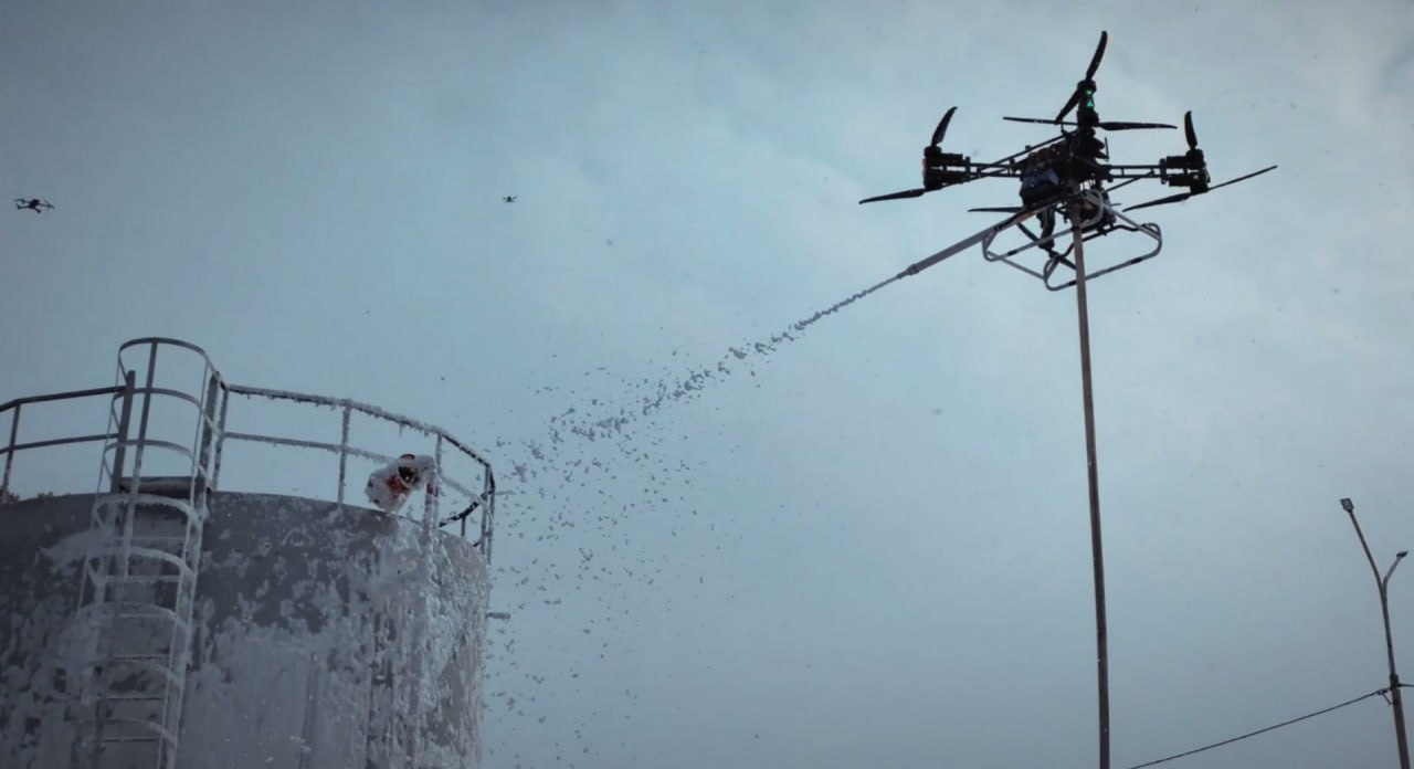Учения прошли на промышленной площадке, где специалисты отрабатывали сценарий пожара в резервуаре с горючей жидкостью. Дрон работал в связке с наземной установкой компрессионной пены. Комплекс разворачивается за 5–10 минут, а само тушение заняло всего 3,5 минуты. Это принципиально новый уровень безопасности для нефтегазовой и химической промышленности.