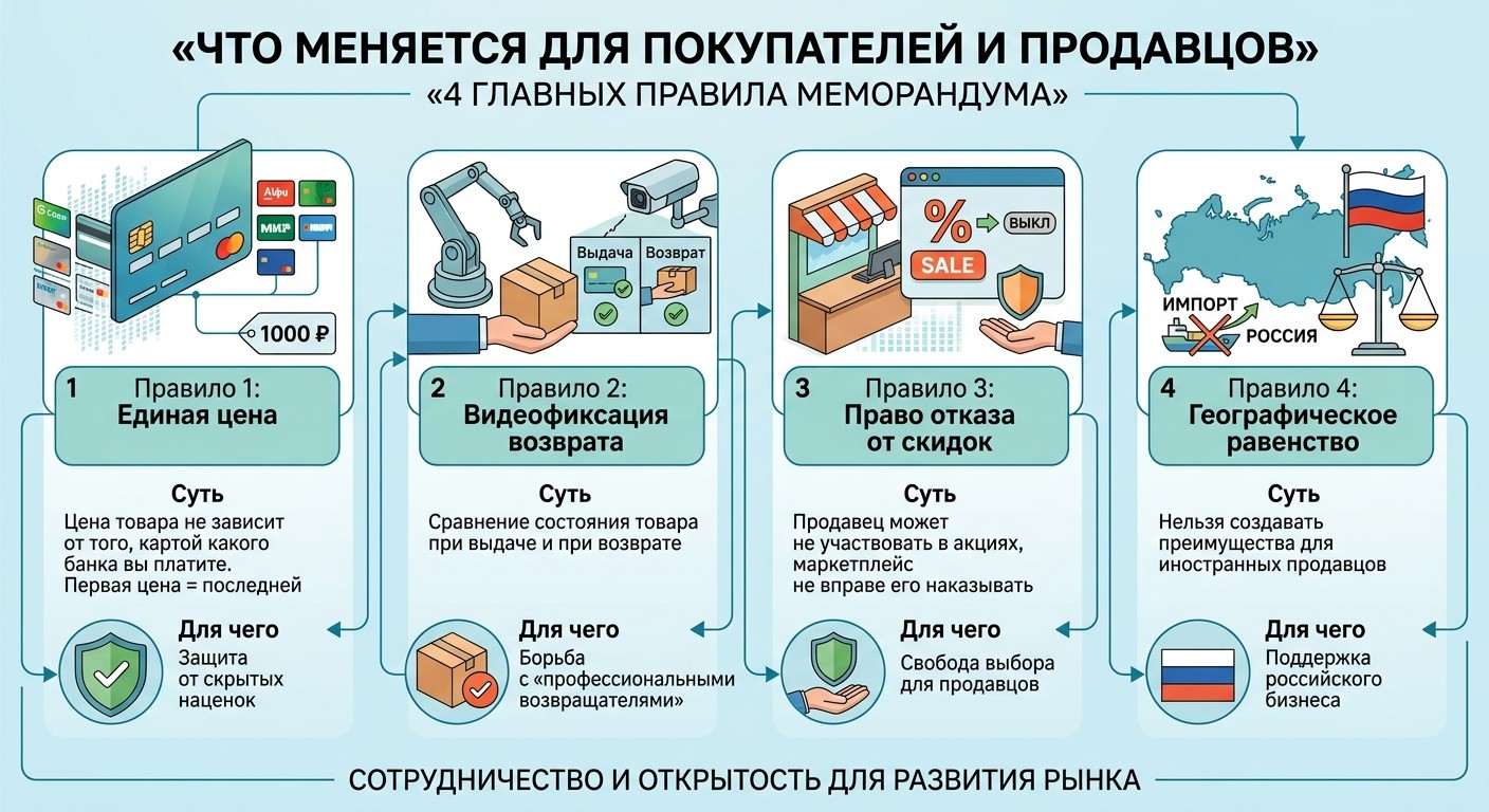 Очевидная цель правительственного приглашения к подписанию меморандума – необходимость примирить разные бизнес-модели в банковской и торговой сферах с потребительскими реалиями. Ну раз мы, покупатели, рублём и поведенчески голосуем за Ozon и Wildberries, значит, нужно не ущемлять маркетплейсы, а, наоборот, подтянуть туда остальных. Объединить, увязать, сбалансировать, пройтись по серединам интересов каждого.