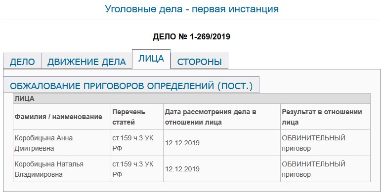 Действия Коробицыной изначально были квалифицированы следствием по ч. 3 ст. 159 УК РФ (мошенничество с использованием служебного положения). В декабре 2019 года Верхнепышминский городской суд признал ее — на тот момент уже спикера гордумы — виновной.