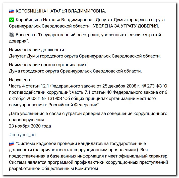 После лишения депутатского мандата Наталья Коробицына была официально включена в «реестр коррупционеров» – государственный реестр лиц, уволенных в связи с утратой доверия.
