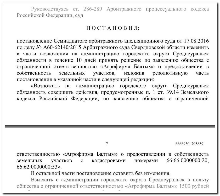 Здесь стоит остановиться подробнее на юридической сути спора. Как следует из итогового постановления Арбитражного суда Уральского округа от 12.12.2016 № Ф09-9833/16, агрофирма «Балтым» через суд добивалась признания незаконным бездействия администрации Среднеуральска, которая уклонялась от предоставления земельных участков.